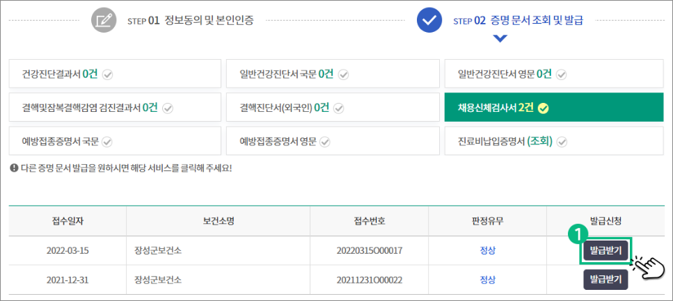 ② 본인 확인 후 신청 가능한 증명서 목록을 확인 후 발급받고자 하는 증명서를 선택합니다. (아래는 예시화면으로 보건증 발급을 하신다면 건강진단서결과서를 클릭해야합니다)