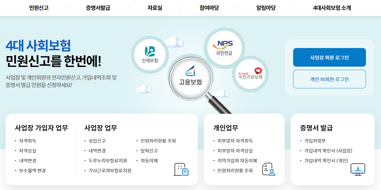 ③ 민원신고 ▶ 개인업무 ▶ 피부양자 자격취득 메뉴를 클릭합니다.