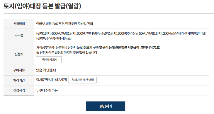 - [온라인발급] : 가장 편리한 방법으로 토지대장을 온라인에서 발급받을 수 있습니다.