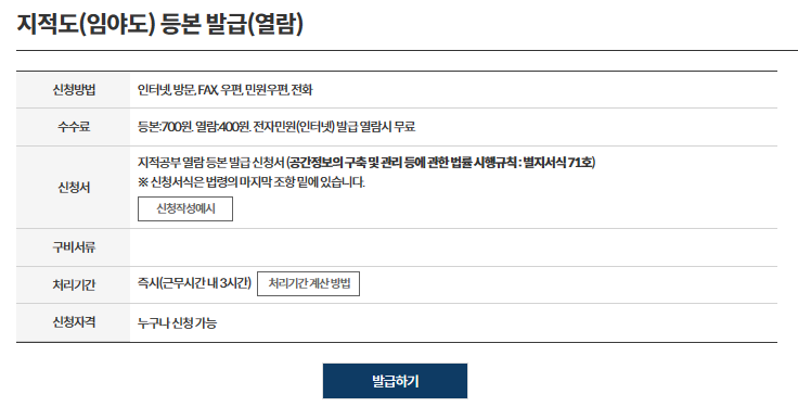 ④ "지적도(임야도) 등본 발급(열람)" 창에서 "발급하기"를 선택합니다.